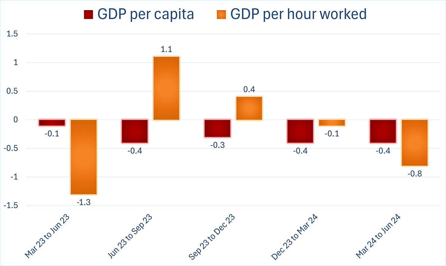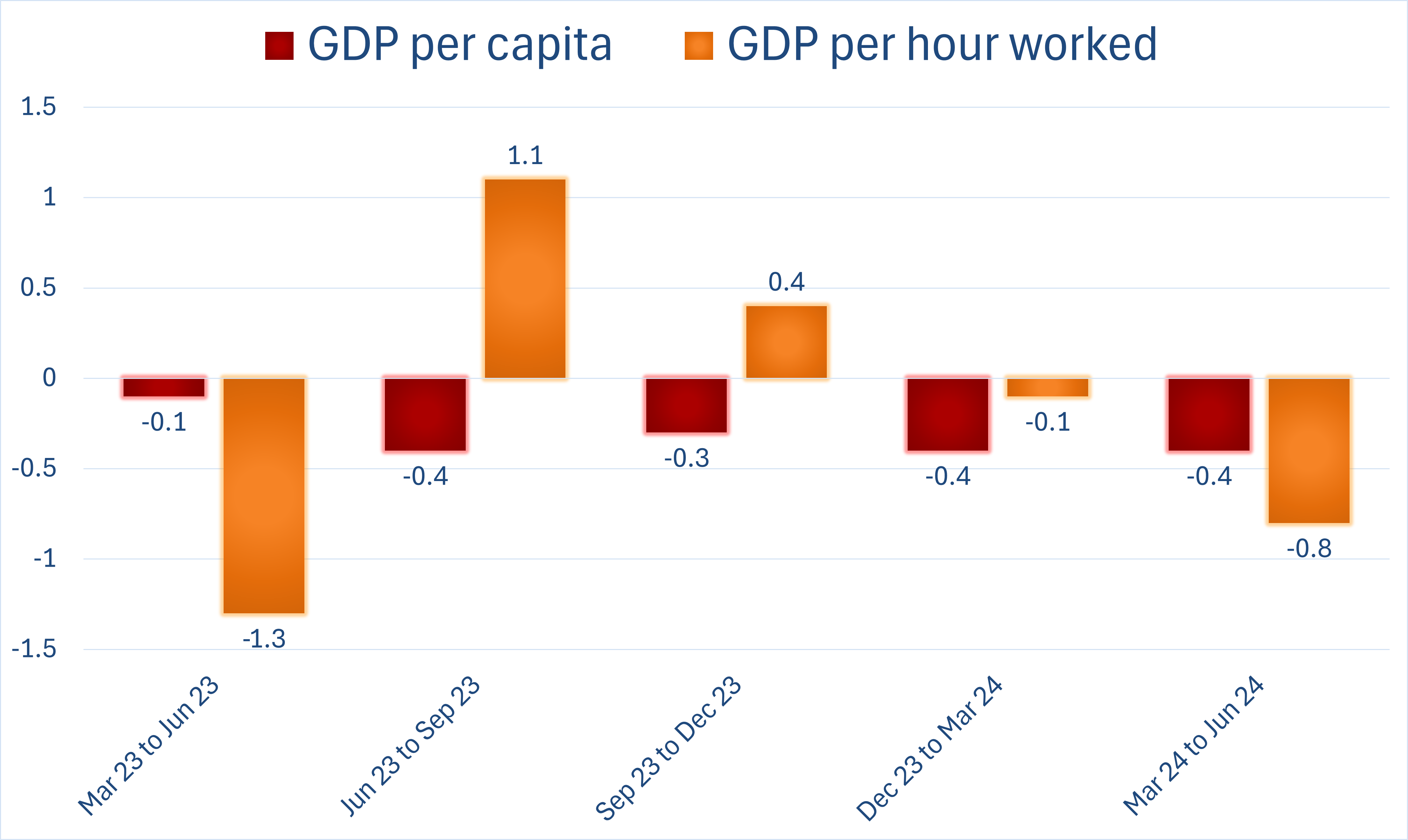 The economy is in bad shape. Australia is in a per capita recession and has been for more than a year. GDP-per-person is falling and is showing little sign of improving. GDP is growing at an anemic rate. GDP per hour is falling, suggesting productivity is worsening. Inflation is still too high. While inflation is under 4%, persistent supply shortages and immigration have kept it elevated. Immigration adds to inflation, but it is also the only reason Australia is not actually in a recession.