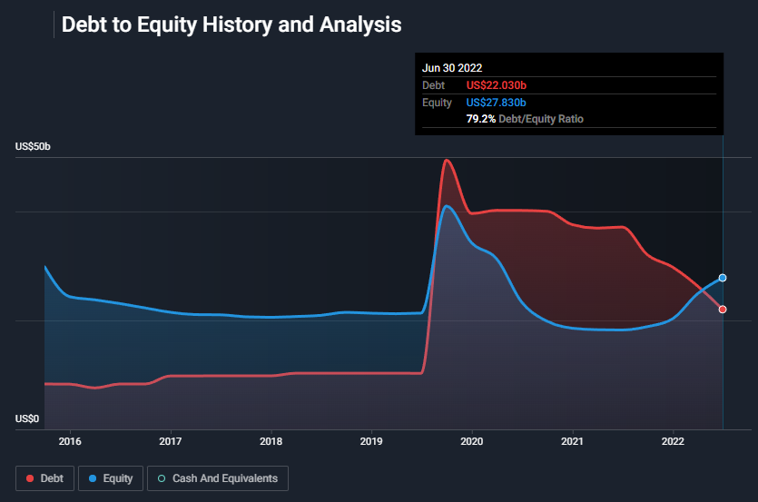 OXY has steadily reduced its debt over time. OXY’s debt increased significantly following the Anadarko acquisition. However, as Simply Wall St documents, OXY has reduced debt significantly and its debt/equity ratio is now around 80%.