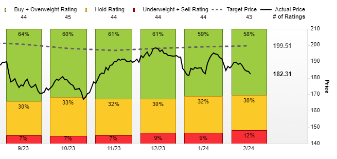 Analyst price targets have remained relatively consistent at around $199 per share. 58% of analysts have a buy recommendation. Now, looking at the time of the sales, which was around Q4 2024, we can see that apple was approaching that price target, which could have made it an attractive time to sell.