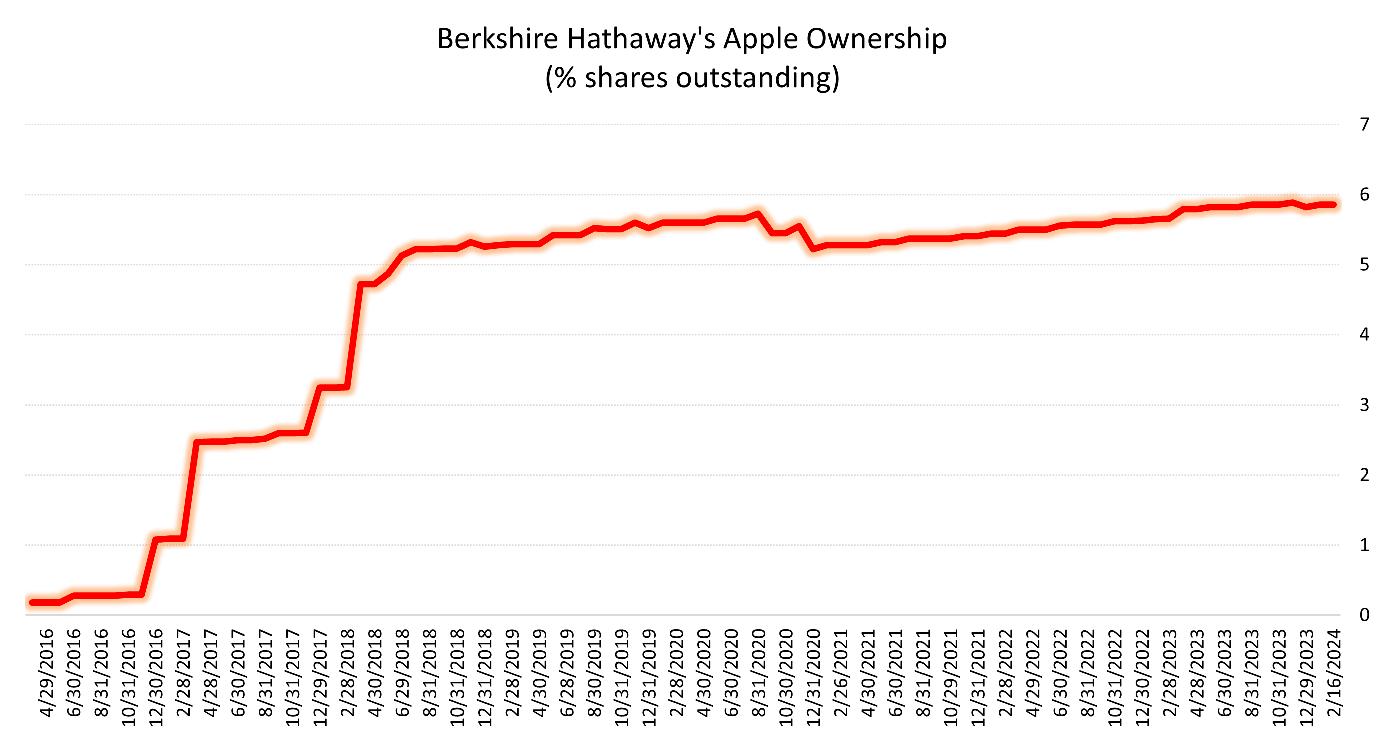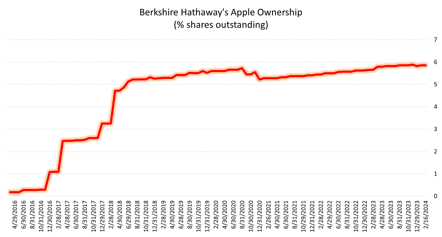 This took Berkshire’s holding from 5.89% of the shares outstanding to 5.82% of the shares. This then increased bac to 5.86% of the shares outstanding after Apple did a stock buyback. This might not sound like much. But, it’s interesting and noteworthy given Warren Buffett’s hyper-bullish stance on apple, especially in relation to its stock buybacks.