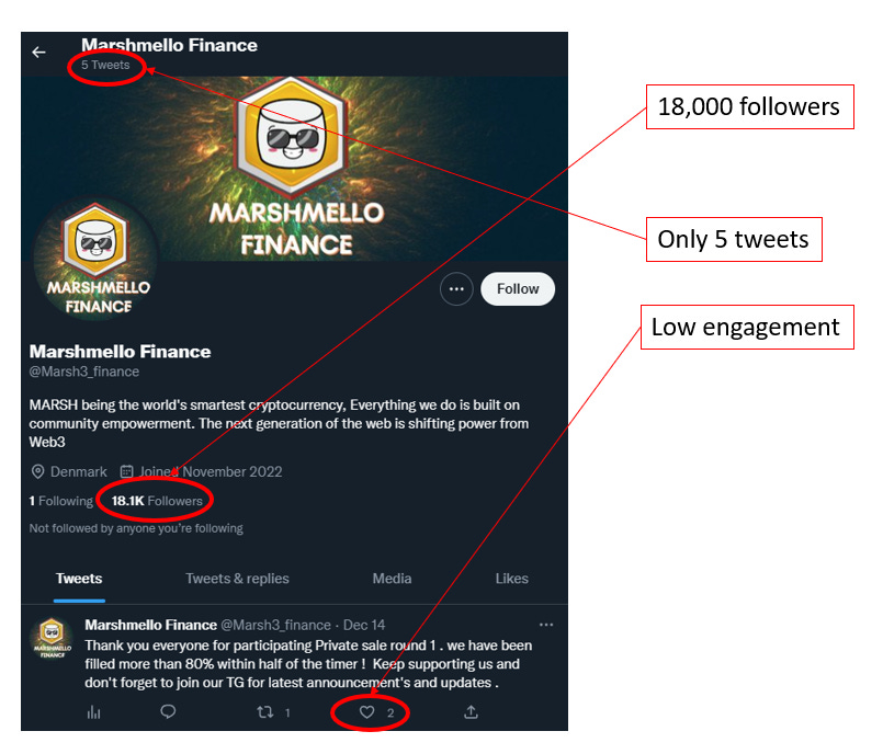The Marshmello twitter account has some 18k followers, but extremely low engagement. The YouTube account has two videos, both of which are dedicated to instructing people how to buy MARSH3. The lack of solid social media presence looks concerning. It makes MARSH3 look like a fly-by-night operation. Indeed, one wonders whether – and how many of – the followers are also bots.