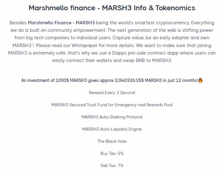 The second red flag is that the token – MARSH3 – promises insane annual yields. For example, the website claims “An investment of 1000$ MARSH3 gives approx 2,040,926.05$ MARSH3 in just 12 months!🔥”. This is clearly nonsense. They also promise a “sustainable price boost of 30% annually and a 20% APY”.