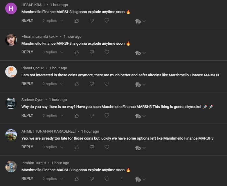 The first major red flag is that they spam YouTube comments. The bots spam inane assertions, such as “Marshmello Finance MARSH3 is gonna explode anytime soon 🔥” or “Why do you say there is no way? Have you seen Marshmello Finance MARSH3 This thing is gonna skyrocket 🚀🚀”. This strongly suggests that Marshmello Finance is not to be taken seriously.