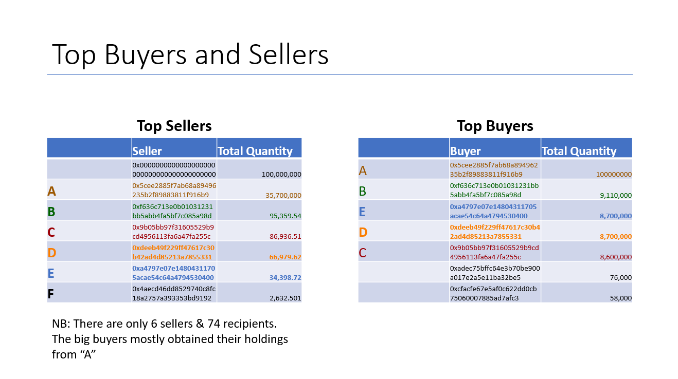Some of the transaction patterns also look odd. There is a weird mix of transfers and buy transactions. While it is possible that Marshmello Finance might classify an initial purchase as a transfer, it is not clear why those transferees might subsequently transfer tokens to other wallets (as opposed to simply sell them).