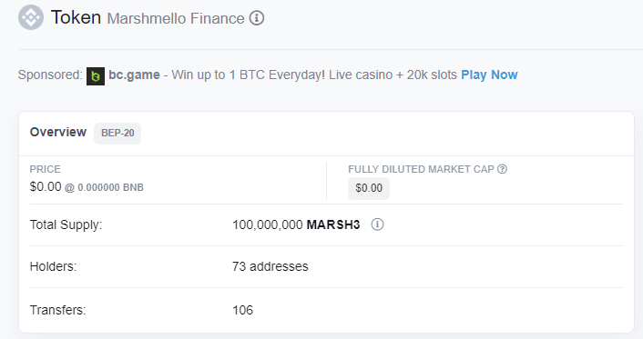 BscScan reports that there are 73 holder addresses. It is not clear whether these are 73 unique people. There are 106 transfers. This is not confidence inspiring.