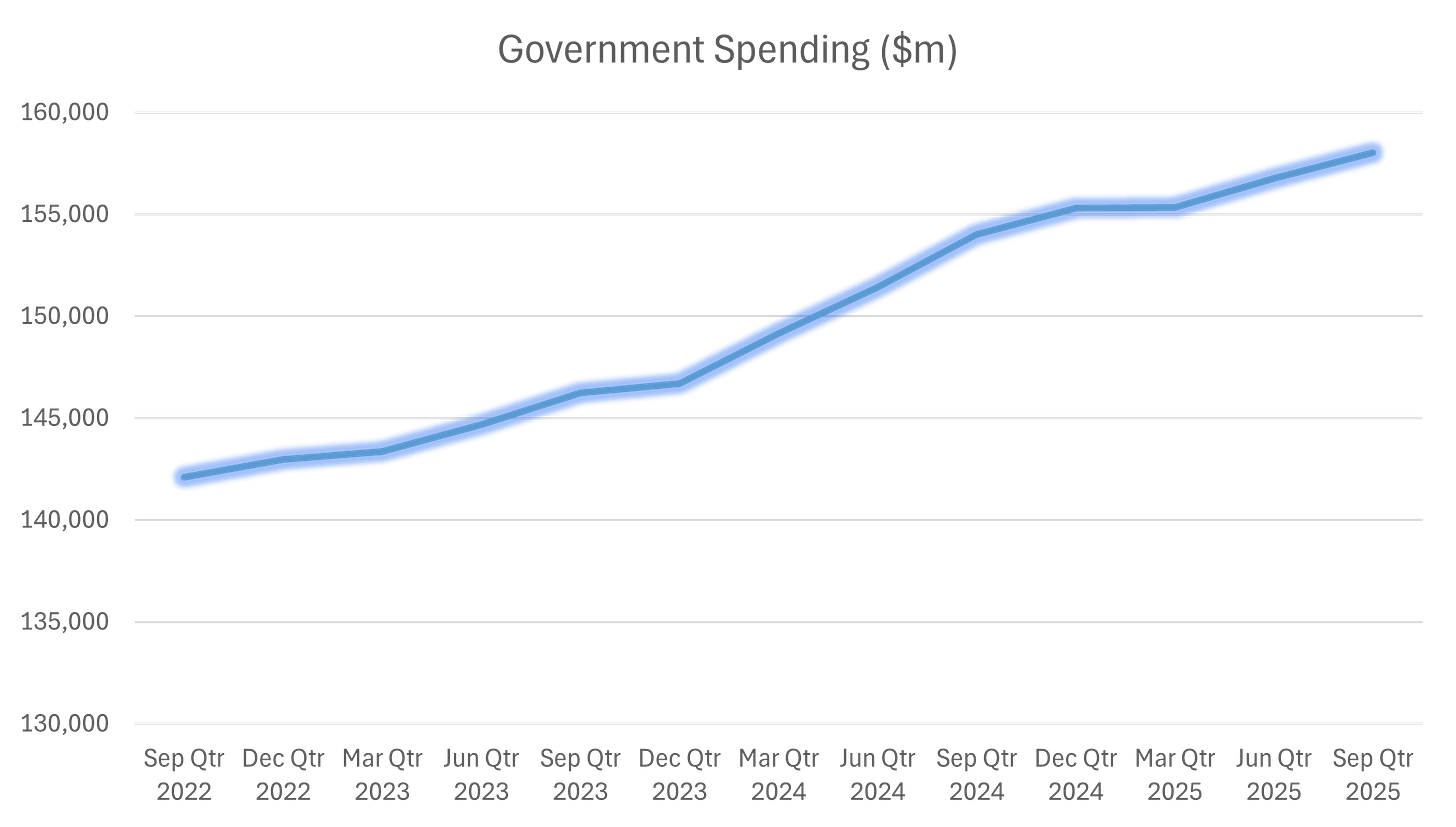 Government spending has consistently increased since Anthony Albanese assumed office in 2022. Of course, inflation can partly explain the increase. However, this is chicken-and-egg. The decision to keep spending at the newer higher prices just ensures that demand continues and stops inflation self-correcting. That is, when consumers are price-sensitive, the cure for high inflation can be inflation itself as high inflation damps demand, which helps prices to normalize. Self-correcting mechanisms are often insufficient to correct inflation, hence why central banks also use interest rates to force such a correction. But, if the consumer – here the government – keeps spending that self-correcting mechanism does not work.