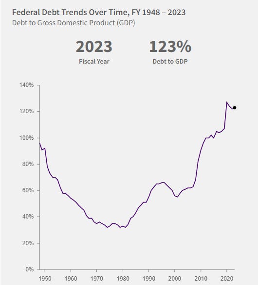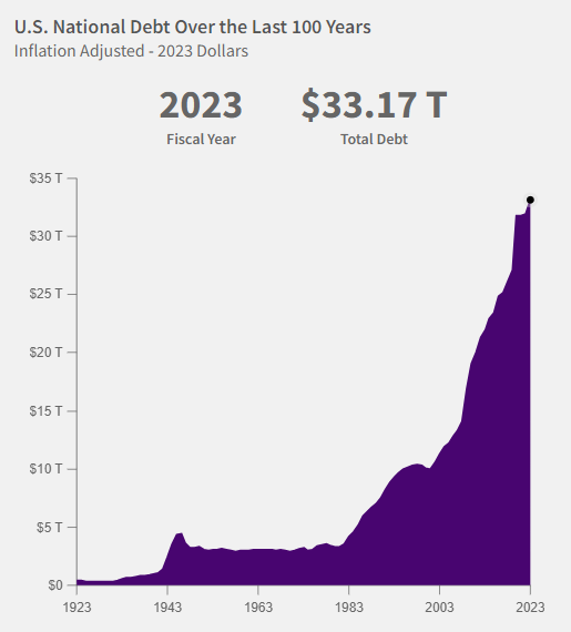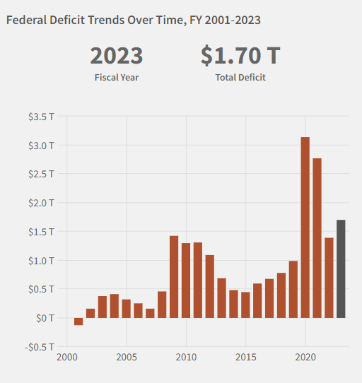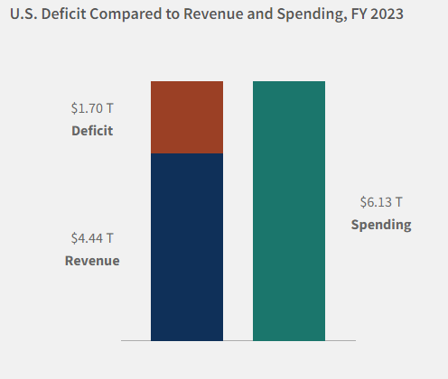 The deficit in FY 2023 was $1.7 trillion. The US spent $6.13 trillion but only brought in $4.44 trillion in revenue. Continued increases in spending exacerbate this. The spending increases arise from a combination of overseas conflicts and social security. Revenue has increased over time, but at a slower pace than have expenses.