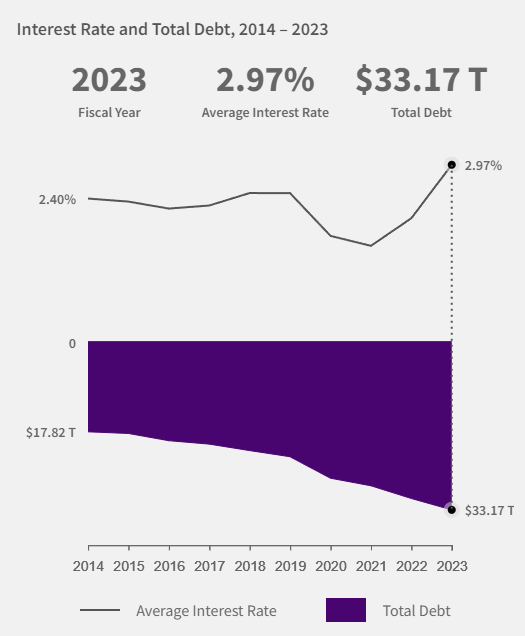 The debt burden is costly. As indicated, the debt attracts interest. This interest is an expense and worsens a budget deficit. The US benefits from the USD being the primary currency for trade and from US government debt being denominated in USD. However, interest rates remain costly. They have recently increased to an average of 2.97%. This is below the Federal Reserve’s target range of 5.25%-5.50%. This is because the interest rate is an average and reflects the interest rate on existing debt. Newly issued debt will be more costly than debt issued when interest rates were low. This is because when the federal funds rate increases, lenders will demand a rate of return that aligns with that rate on any new borrowings they give to the government. Thus, unless the Federal Reserve cuts rates, or the US resolves the level of debt and its deficit, the imbalance could worsen.