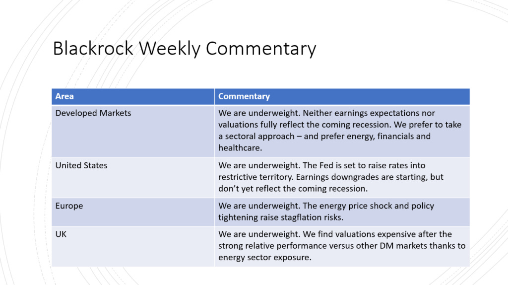 Blackrock also indicates that the market has not yet fully priced in worsening earnings, earnings could decline further, an the Federal Reserve is likely to exacerbate this by keeping interest rates too high into an economic downturn.