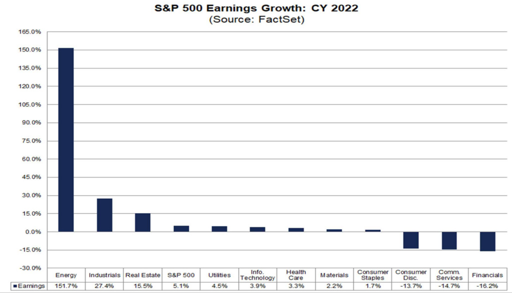 Corporate earnings are not looking positive. In 2022, energy companies were the only sector to experience strong earnings growth. Indeed, consumer discretionary, financials, and commercial services experienced negative earnings growth (based on CY 2022 estimates).