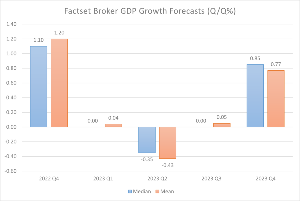 Factset also reports similar sentiments for GDP growth forecasts. Here, Factset reports analysts’ economic forecasts and indicates that growth in Q1-Q3 is expected to be near zero or negative. However, growth might be positive in 2023 Q4. It is important to not over-emphasize such forecasts. Long-dated forecasts can be notoriously inaccurate.