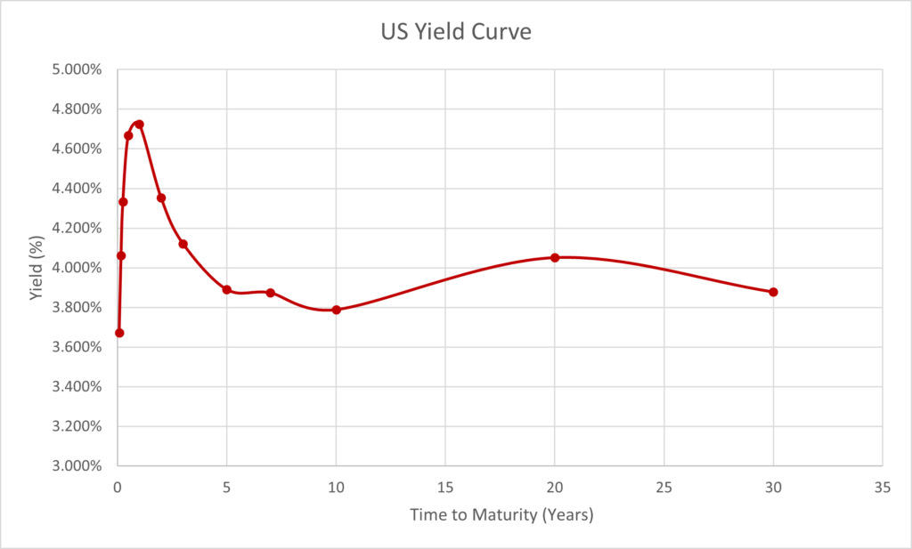 The US Yield curve is significantly inverted. The 2-year yield is 56.5bps higher than the 10-year yield. This suggests that the market is pricing in significant rate cuts. The 2-year yield is also significantly higher than that of the 3,5, and 7 year yields. Thus, the yield curve suggests a strong recession possibility.