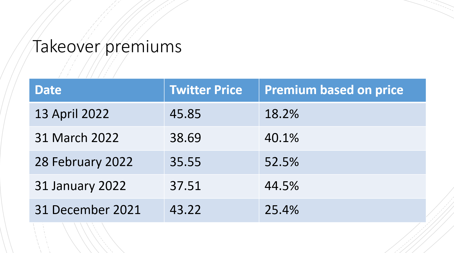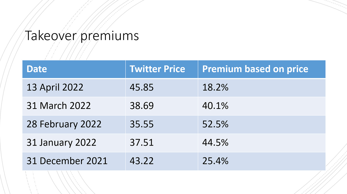 1. Twitter is not a nascent firm. While it is notionally a ‘tech’ firm, it has significant analyst coverage and is not an early stage company. Further, Elon Musk has not launched an ‘opportunistic’ takeover bid. His takeover offer is at an 18% premium to the price the day before the offer. It is a 38% premium to before his ownership was announced. It is around a 50% premium to before he started buying shares.
