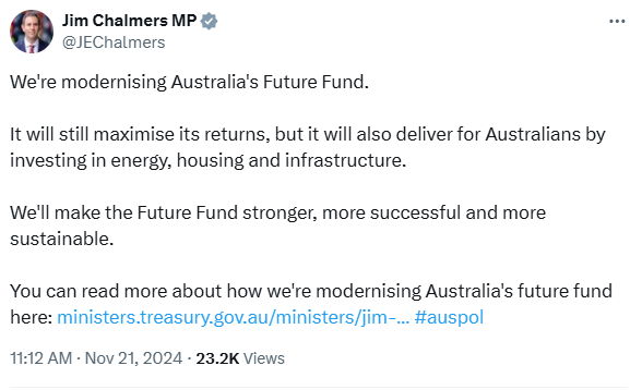 Jim Chalmers has claimed to be “modernizing” the Future Fund to make it “stronger, more successful, and more sustainable”. He asserted that the Future Fund will “still maximize its returns but it will also deliver for Australians by investing in energy, housing and infrastructure”.