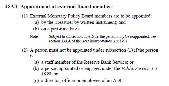 The Bill effectively splits the RBA’s board into a ‘governance board’ and a ‘monetary policy board’, the latter of which sets interest rates. Both the monetary policy board and the governance board have nine members: three from the RBA and six external members. The treasurer appoints those six external members.