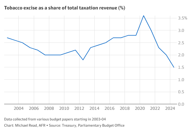 Despite an increasing tax rate, tobacco excise revenue has hit a 9-year low. This is telling. Tax rates are increasing, but the total tax take is falling.