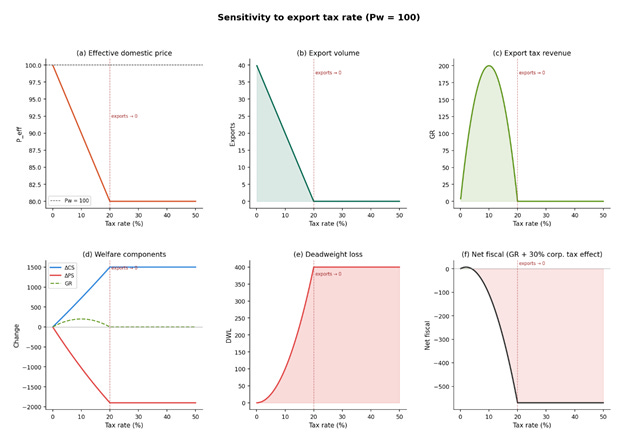 Figure 2: Export tax sensitivity: Each panel shows the response of a key variable to export tax rates from 0% to 50%, holding the world price at $100/barrel and the corporate tax rate at 30%. The vertical dashed line marks the export-killing threshold ( 20%), beyond which the economy enters autarky. Panel (a): effective domestic price. Panel (b): export volume. Panel (c): export tax revenue, which peaks at approximately T= 10%. Panel (d): changes in consumer surplus, producer surplus, and export tax revenue. Panel (e): deadweight loss. Panel (f): net fiscal position (export tax revenue plus change in corporate tax receipts), which turns negative at approximately T= 4%.