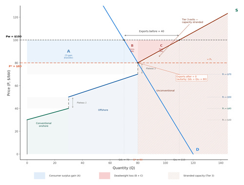 Figure 1: Supply and Demand, and welfare effects of a 25% export tax. The stepped supply curve reflects three production tiers with breakeven prices at $30, $50, and $80/bbl. Before the tax, the world price of $100 supports 110 units of supply, 70 of domestic demand, and 40 units of exports. The export tax drives the domestic price to $80 (the autarky equilibrium), eliminating Tier 3, contracting supply to 80, and absorbing all output domestically. Area A represents the consumer surplus gain; areas B and C represent consumption and production deadweight loss respectively. The hatched region denotes stranded Tier 3 capacity.